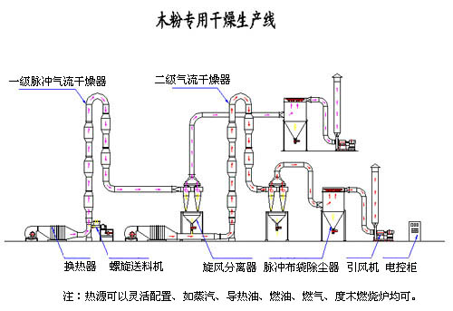 木粉干燥具有产量大但干燥温度不能太高的特点,干燥温度过高容易起火,采用传统的设备很难满足大生产的要求。我公司设计了木粉专用干燥生产线,采用两级组合脉冲气流干燥,取得了很好的效果。